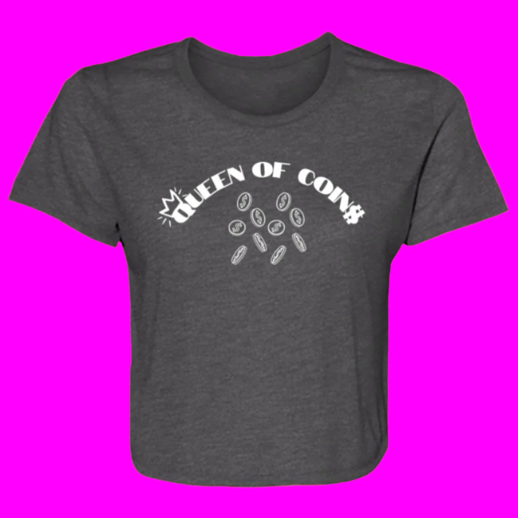 The Queen of Coins Ladies Flowy Crop (with white lettering)